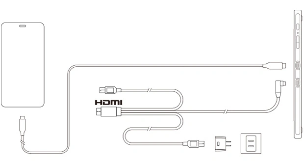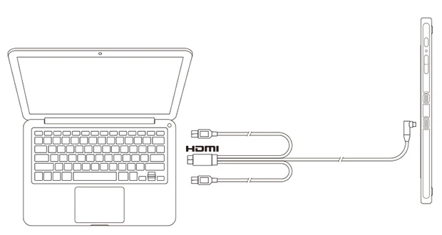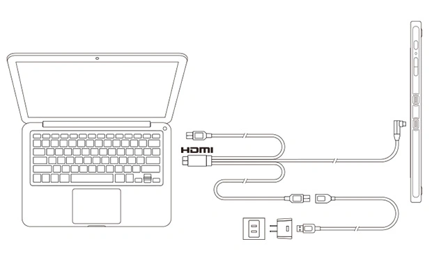 a. 将 USB-C头连接手绘屏,然后将 HDMI头及黑色、红色 USB-A头连接电脑。