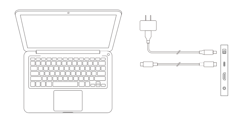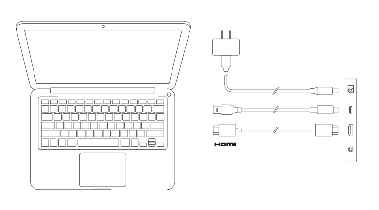 如下图所示,您需要将HDMI连接线分别连接到您的电脑及手绘屏的HDMI端口,用于传输视频信号;并将USB-C to USB-A连接线或USB-C to USB-C连接线分别连接到您的电脑及手绘屏的USB端口,用于传输数据信号。