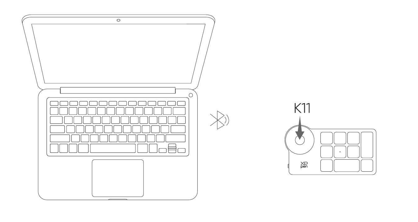 1) 拨动无线快捷键盘电源开关,无线快捷键盘的指示灯蓝色慢闪,长按K11键6秒进入配对状态,指示灯蓝色快闪。