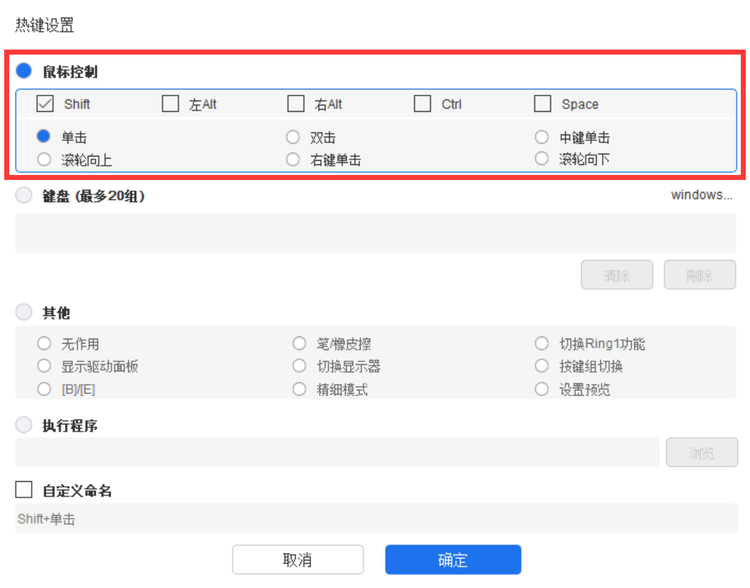 设置鼠标和键盘组合键,如选择“Shift”和“单击”后,可在支持此组合键的软件中实现此快捷操作。