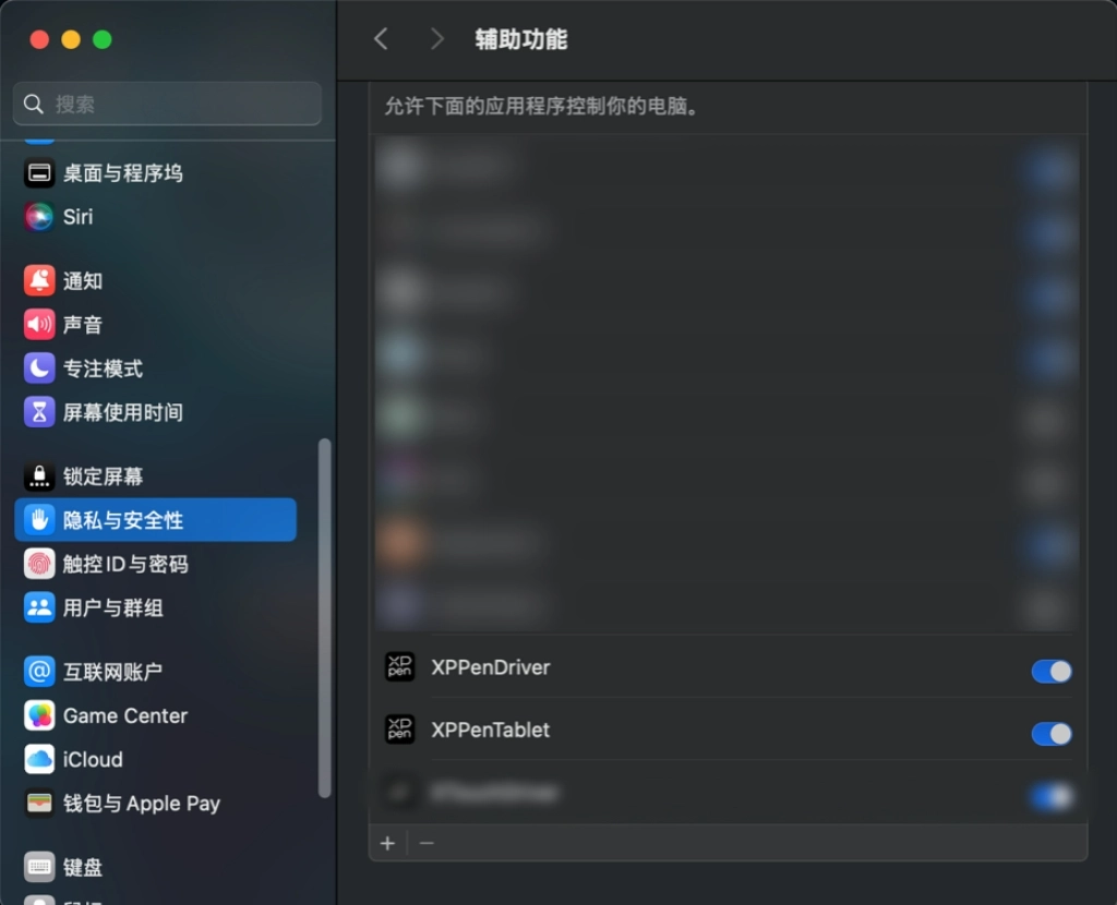 解压后运行“pkg”文件,根据提示完成安装,然后添加所需的安全设置(系统设置->隐私与安全性->辅助功能),授权解锁后,请确保XPPenDriver以及XPPenTablet选项已被勾选;否则,设备和驱动可能无法正常工作。