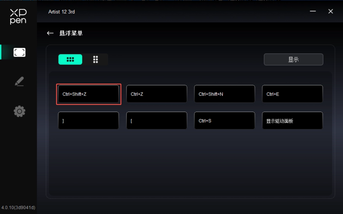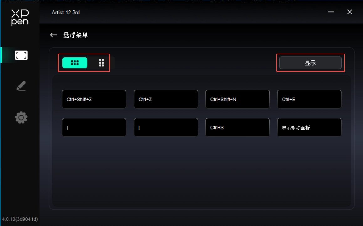 悬浮菜单可以在手绘屏或电脑显示器上显示悬浮快捷键。您可以将常用操作设置在悬浮菜单上,然后使用手绘笔或鼠标点击该按钮并执行所设置的操作。您可以通过点击驱动首页的“悬浮菜单”按钮进入悬浮菜单页面自定义显示方式及功能。