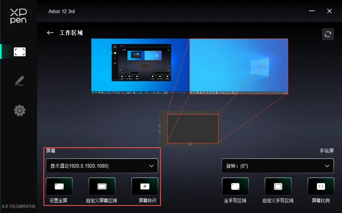 如果您正在使用多个显示器,且显示器设置为扩展模式,请在屏幕选项卡选择设备工作区域映射到哪个显示器上。