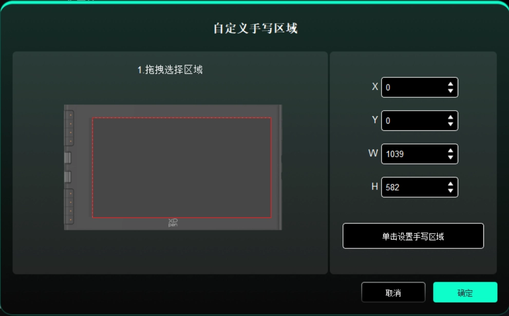 单击设置手写区域:单击后,用手绘笔在设备工作区域上点击要选取的“左上角”位置和“右下角”位置。