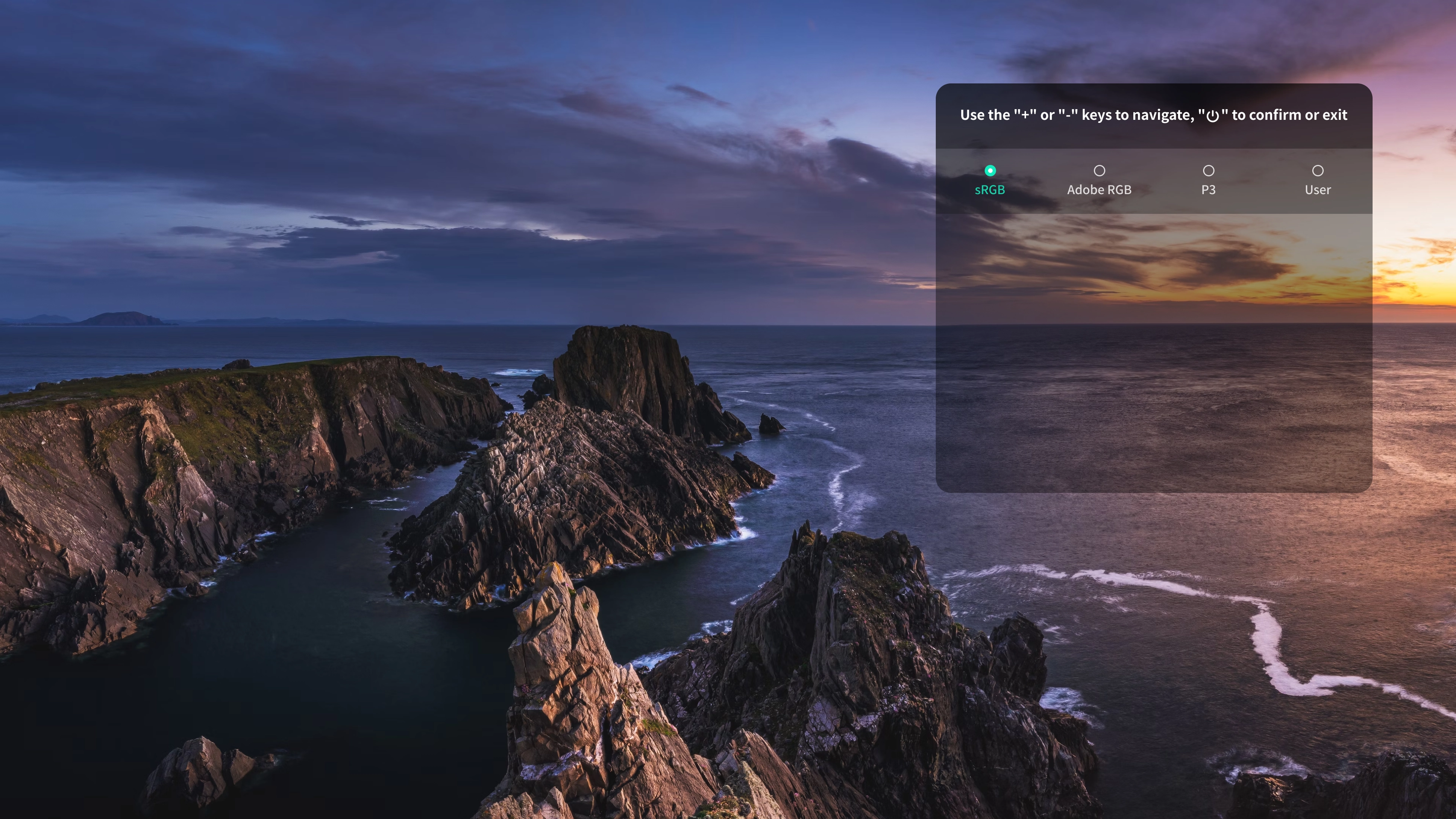 2. 点击亮度“+”或“-” 键进行导航,选择你需要的色彩设置,然后点击电源键,完成确认或退出操作。