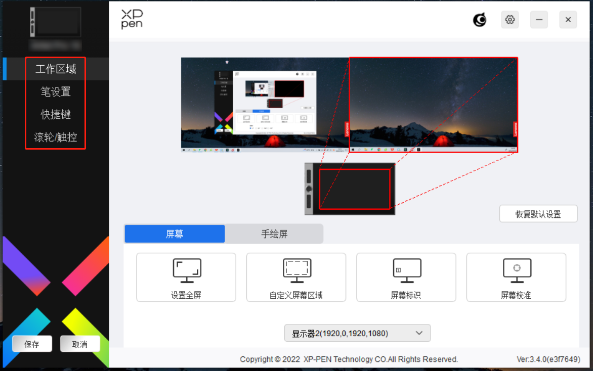 工作区域设置可以帮助您定义设备工作区域和屏幕显示区域的映射关系。