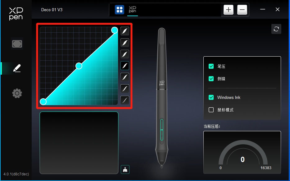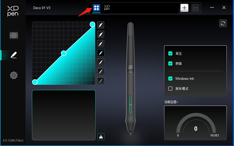 6)若笔压测试正常(Windows:在驱动程序笔设置界面,确保Windows ink已开启);再开启绘图软件测试。
