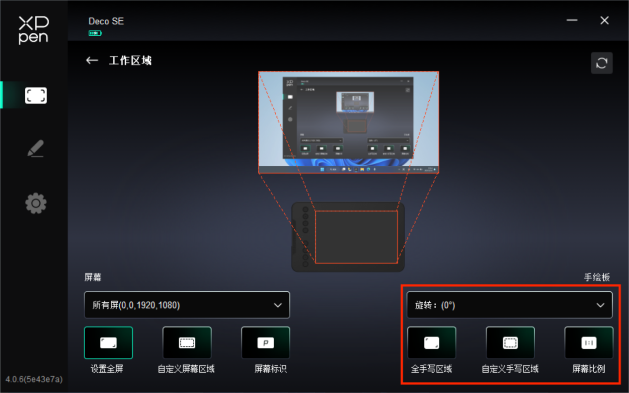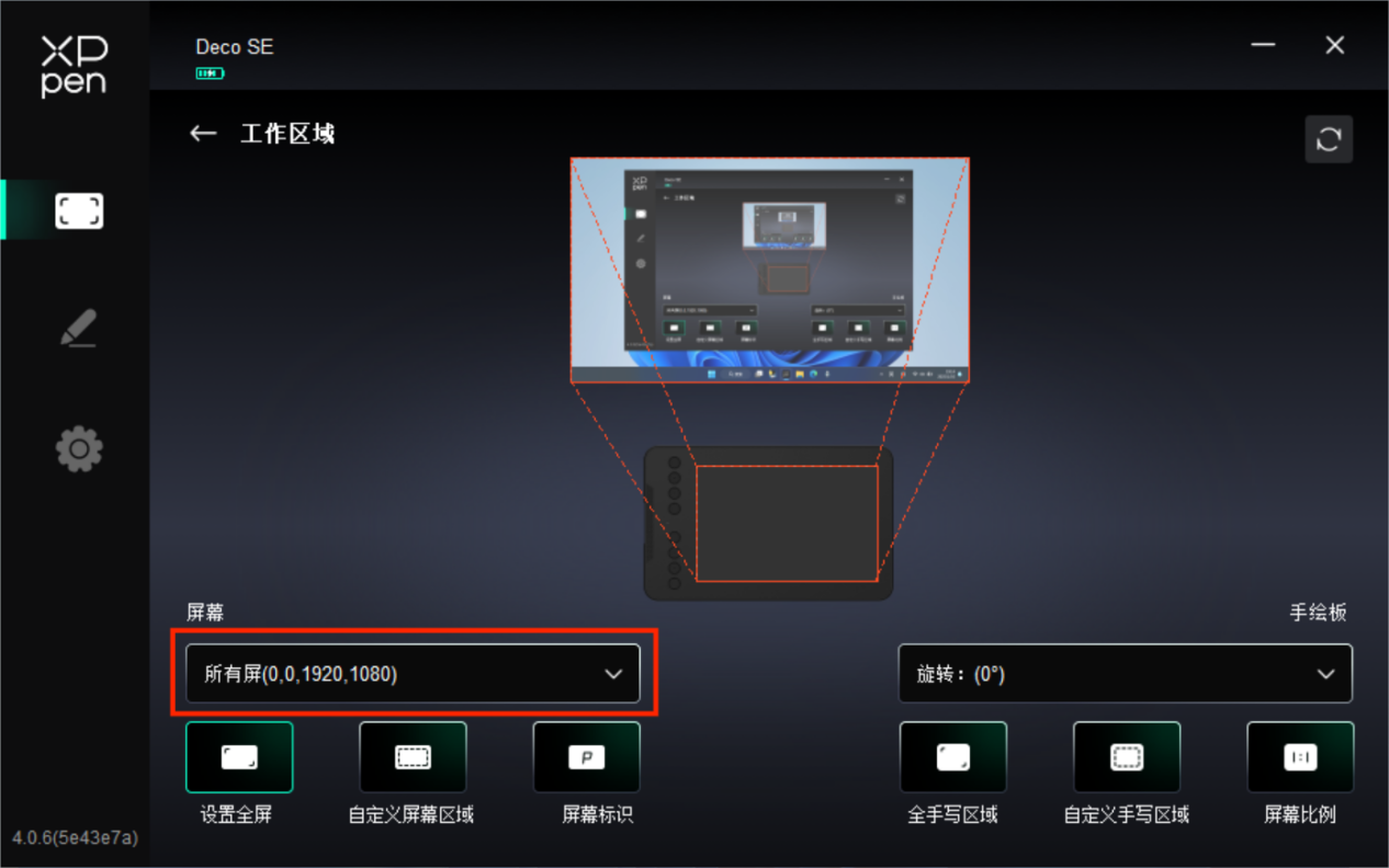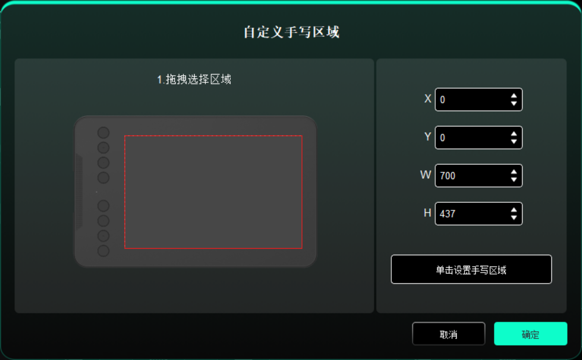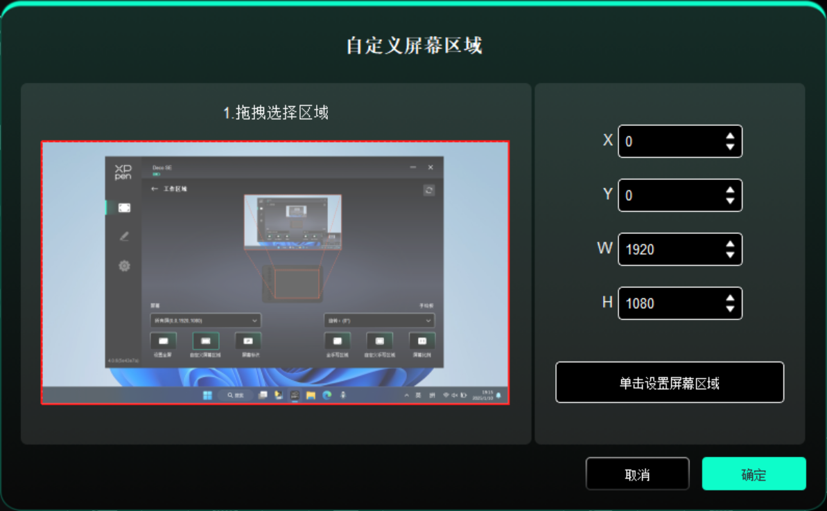 单击设置屏幕区域:单击后,用手绘笔在设备工作区域上点击要选取的“左上角”位置和“右下角”位置。