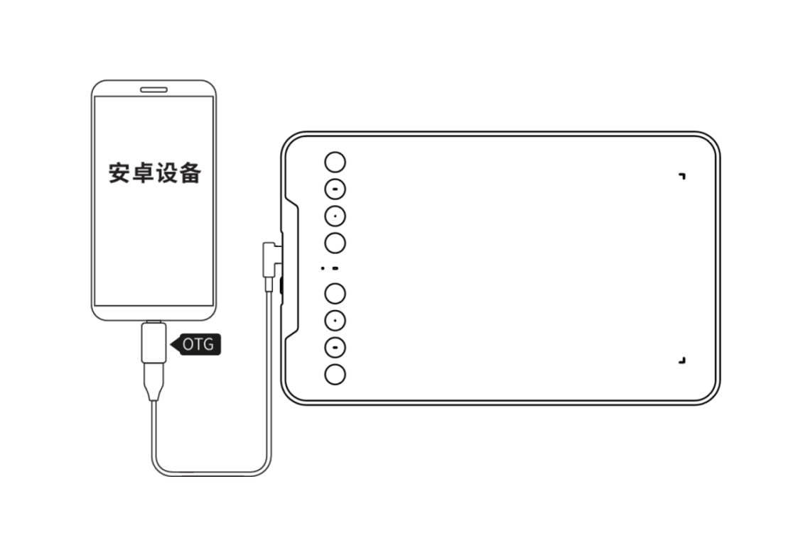 先用USB-A to USB-C连接线将手绘板连接到OTG转接头,然后再连接到安卓手机或平板。