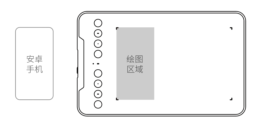 1)默认手绘板方向为0°,绘图区域为左方,支持左、中、右三个位置切换使用。