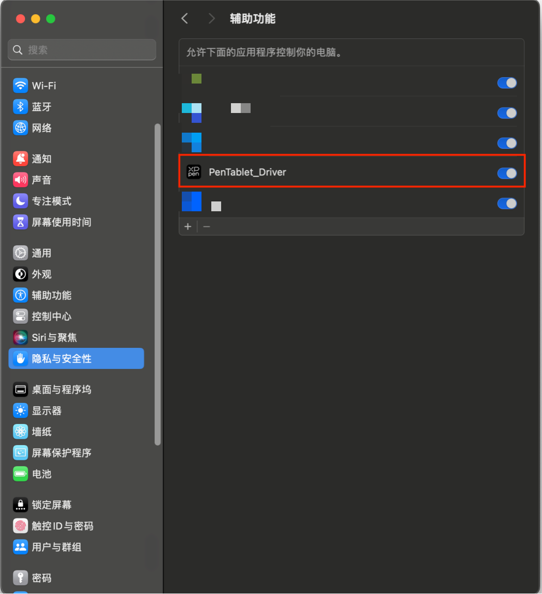 解压后运行“pkg”文件,根据提示完成安装,然后添加所需的安全设置(有线:系统设置->隐私与安全性->辅助功能),点击添加图标,授权解锁后,请确保PenTablet_Driver选项已被勾选;否则,设备和驱动可能无法正常工作。