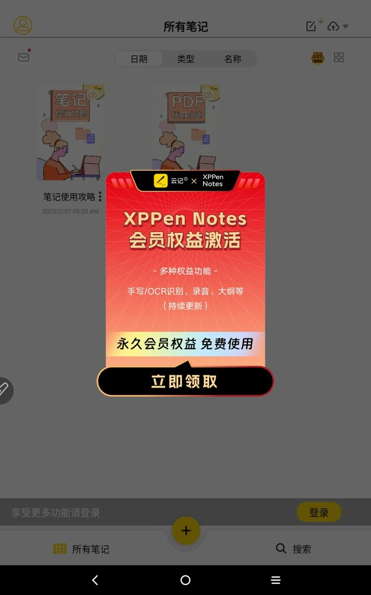 第三步:第一次启动XPPen Notes app首页会弹出领取会员相关信息,点击立即领取,如下图所示: