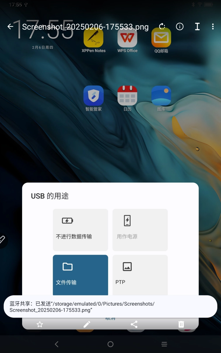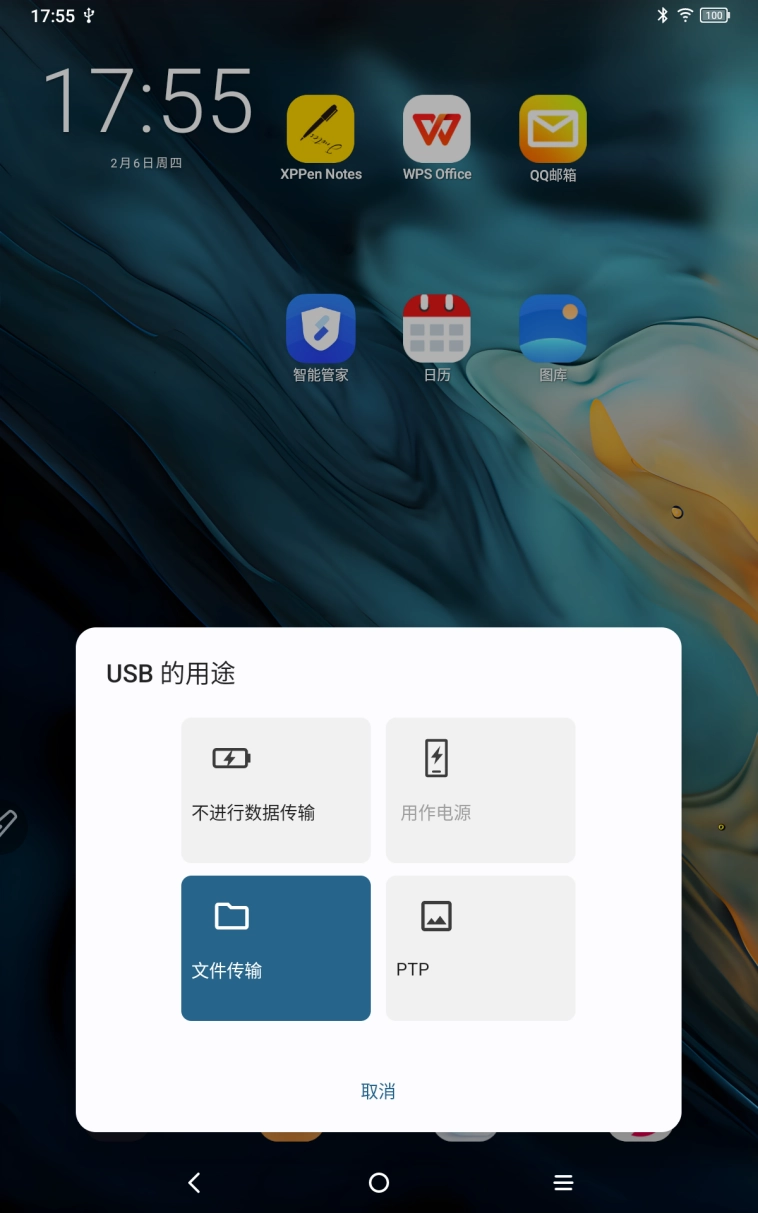 第二步:平板上会出现如下图弹窗,提示用户选择使用方式(传输文件或传输图片)